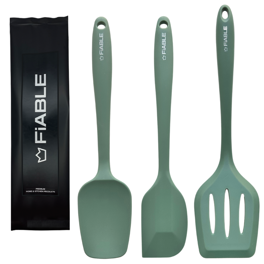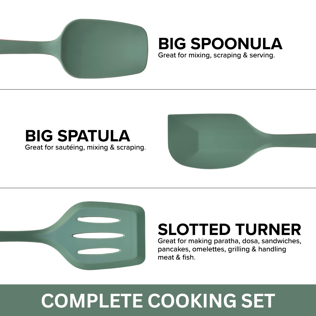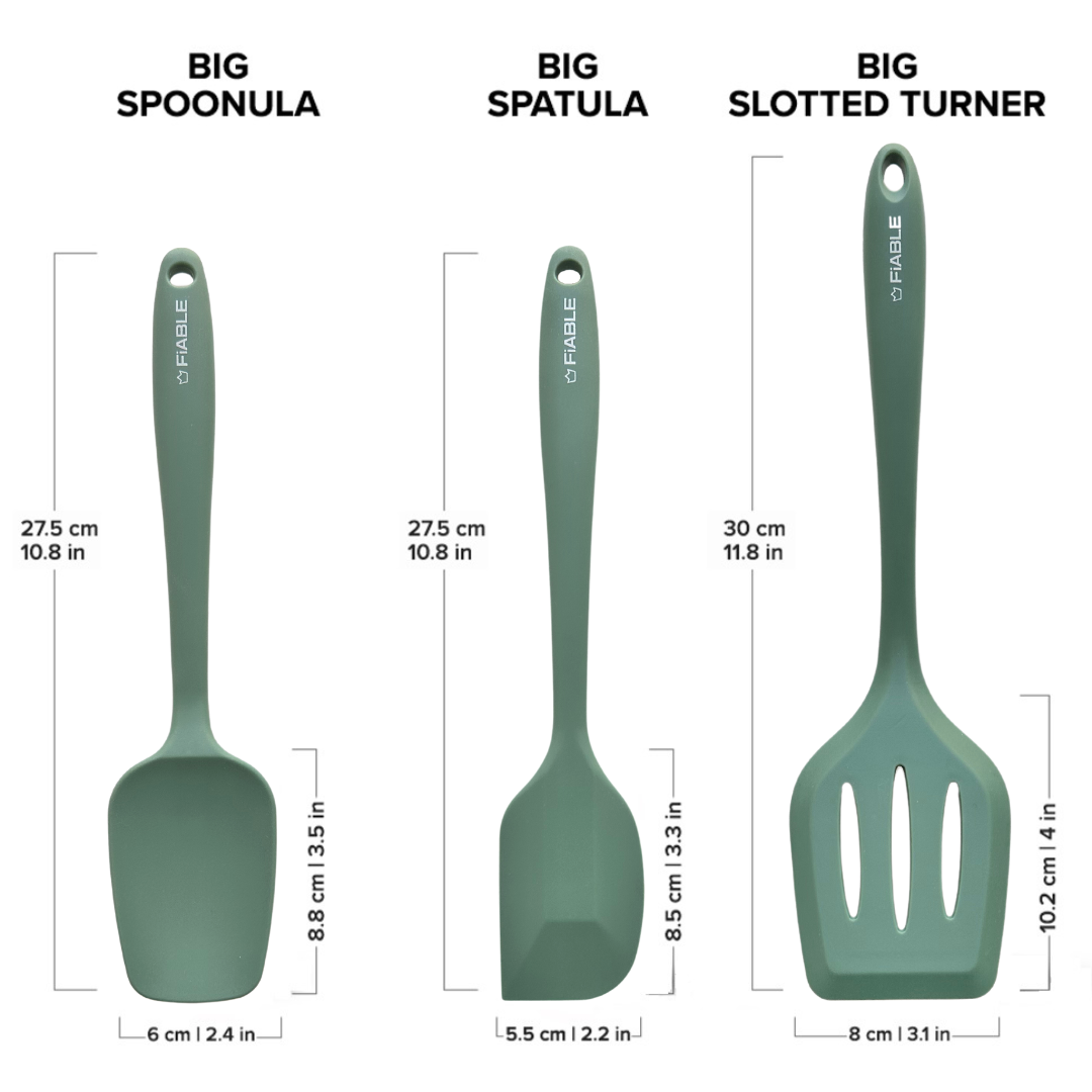 - FiABLE Kitchen Essentials Spatula Set of 3 comes with 1 Big Spatula (Green) and 1 Big Spoonula (Green) and 1 BIG Turner (Green).