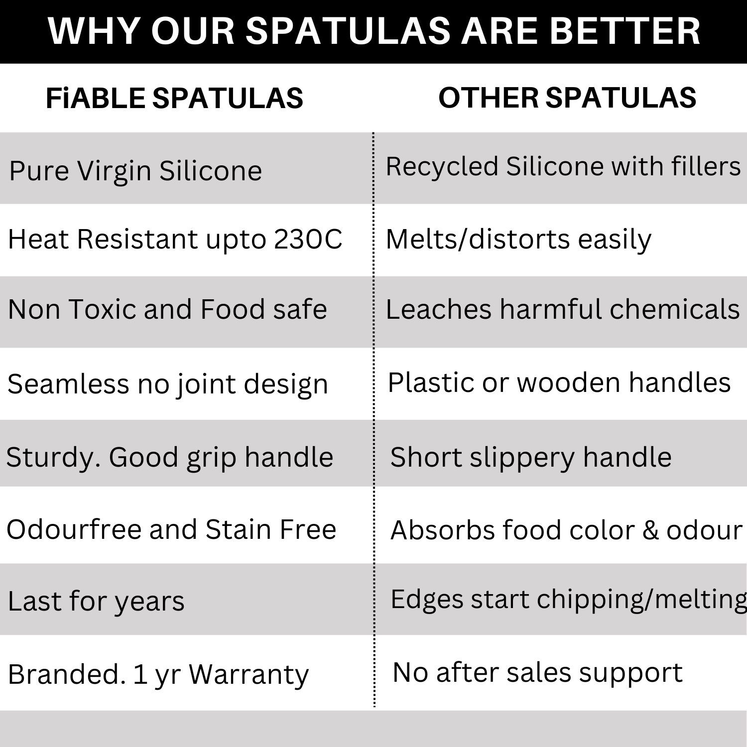 FiABLE Spatulas are made of Premium Food grade FDA Approved, BPA FREE Silicone. They are completely high-heat resistant up to 230°C. They will neither melt nor leach chemicals into food like the nylon or inferior silicone spatulas. They are suitable for all cooking and baking needs. Embedded Stainless Steel inner core gives the required strength and sturdiness to the spatulas to their job perfectly.